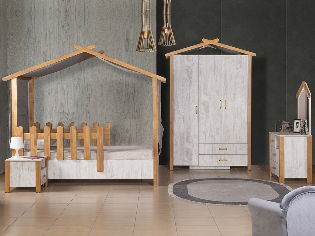 3 Kapaklı Dolap + 100*200 Karyola + Aynalı Şifonyer + Çalışma Masası + Komodin + Kitaplık + Korkuluk